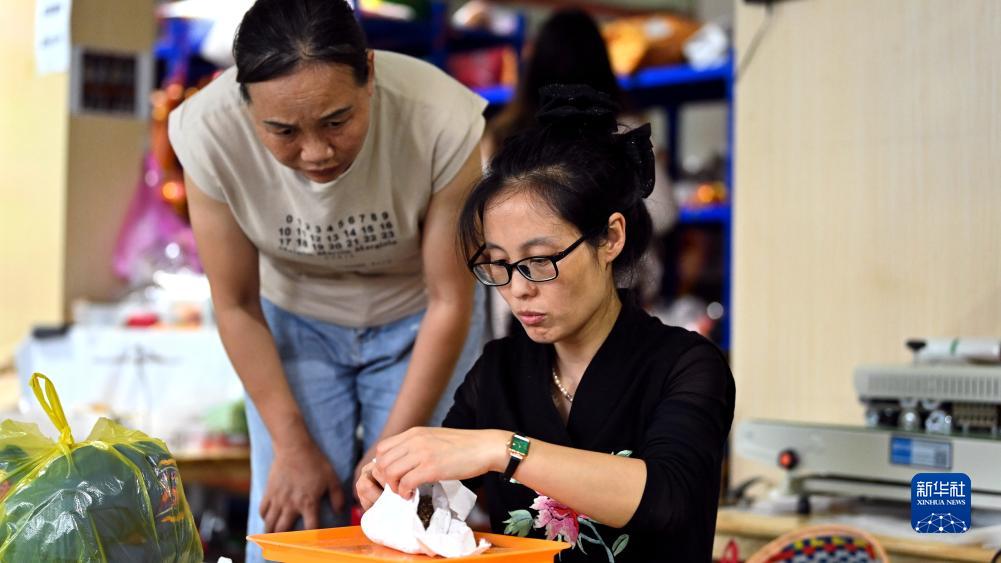 在靖西市非遺傳承人王秀芬繡球制作車間,王秀芬(右)在稱取香料制作香囊(8月2日攝)。