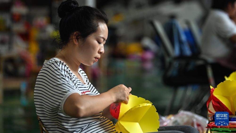 在靖西市非遺傳承人王秀芬繡球制作車間,一名繡娘在制作繡球內襯(8月2日攝)。