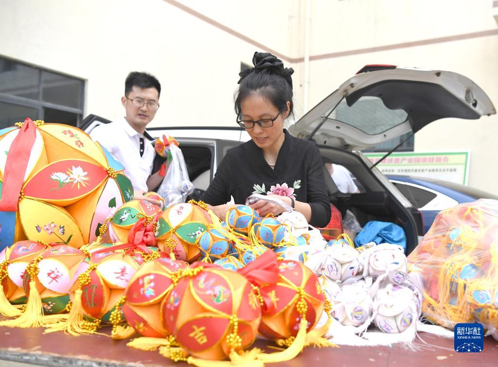 靖西市非遺傳承人王秀芬(右)查看從村民家回收的繡球(8月2日攝)。