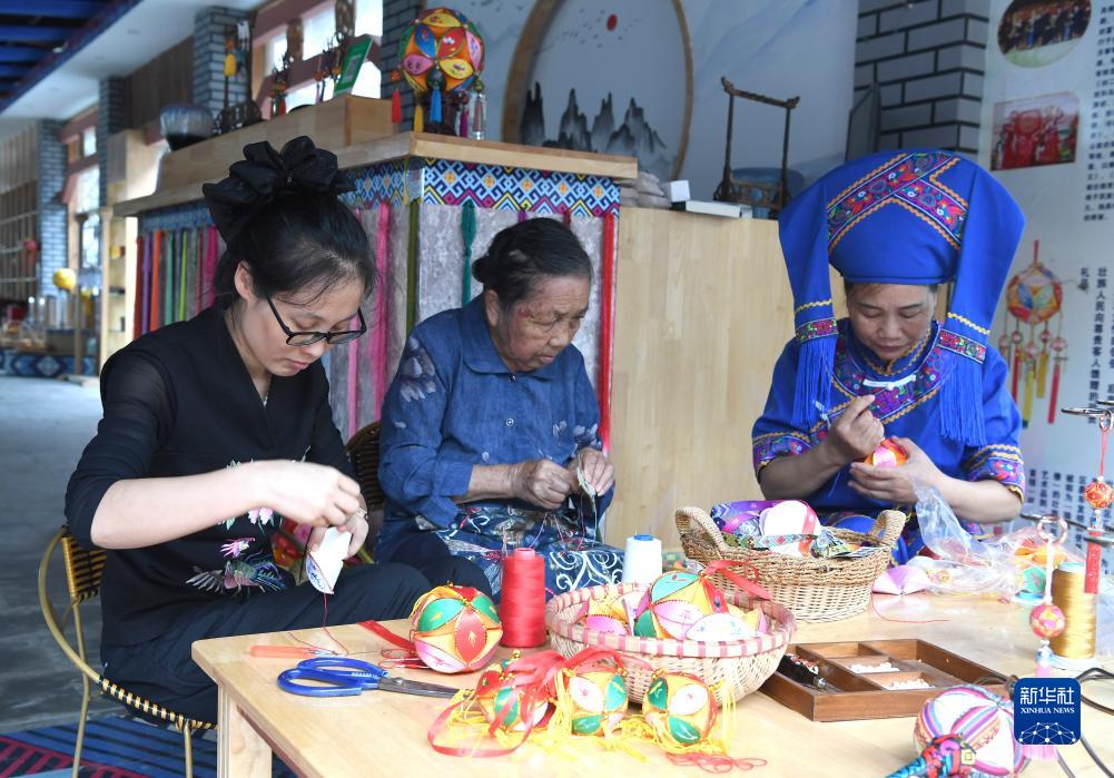 靖西市非遺傳承人王秀芬(左一)在舊州村和村民一起制作繡球(8月2日攝)。