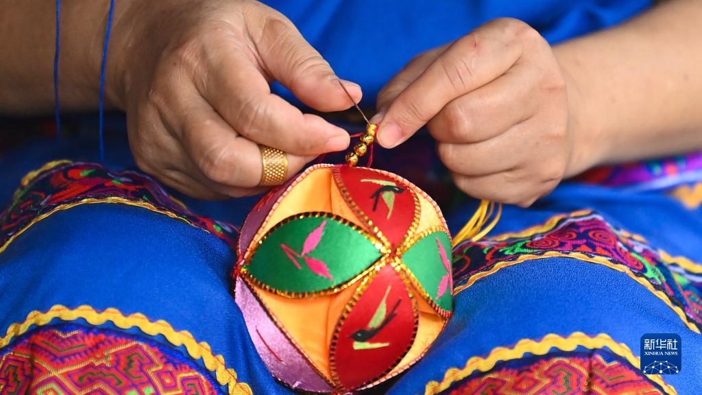 在靖西市舊州村,一名繡娘在將繡球組合成型(8月2日攝)。