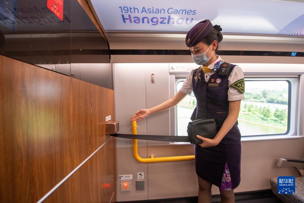 8月4日,鐵路杭州客運段乘務員展示復興號亞運智能動車組車廂內的無障礙設施——輪椅固定處。