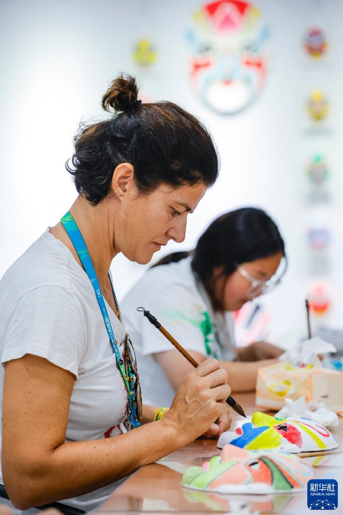 8月2日,在成都大運村的互動體驗中心,意大利代表團成員費代麗卡·弗雷迪亞尼(左)繪制中國戲劇臉譜。