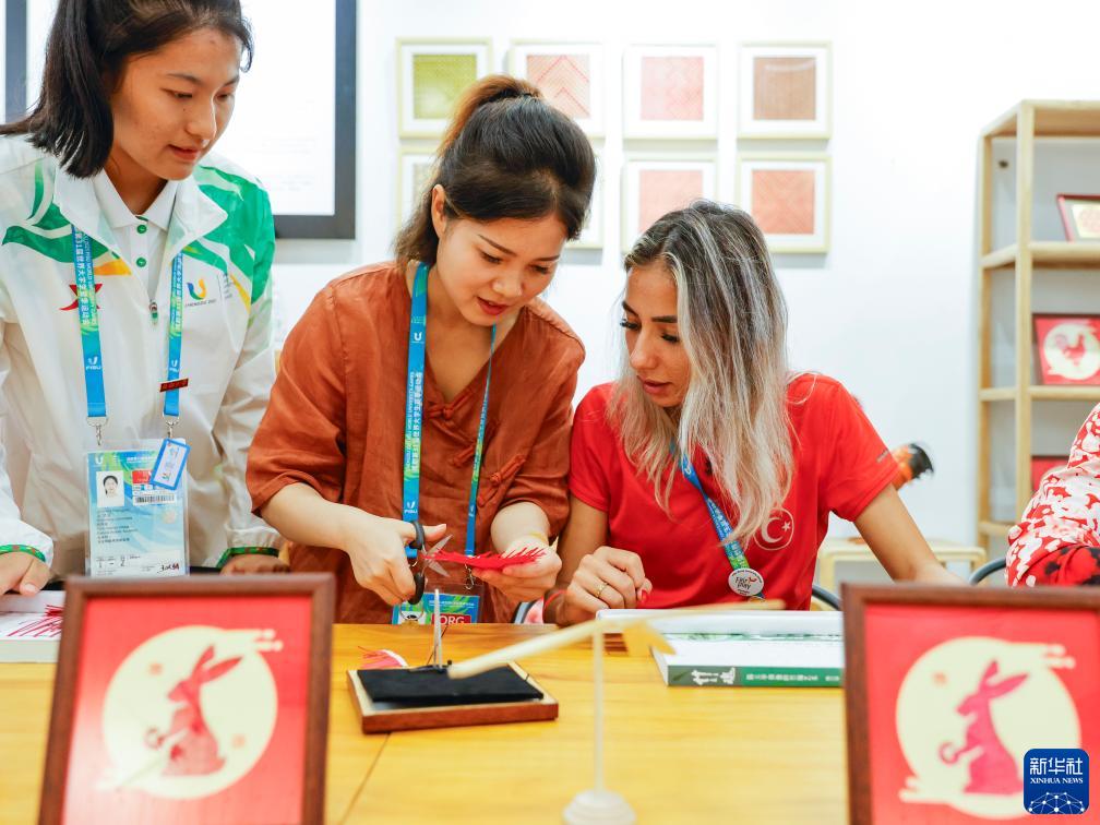 成都大運村里設置了包括皮影、剪紙、刺繡、草編等非遺項目在內的中國文化體驗項目,吸引眾多代表團成員前來參與。在這里,各代表團成員可以更加切近地感受、了解中國非遺文化的魅力。