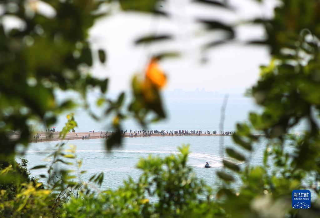 8月4日,游客在蓬萊長島黃渤海交匯處游玩。