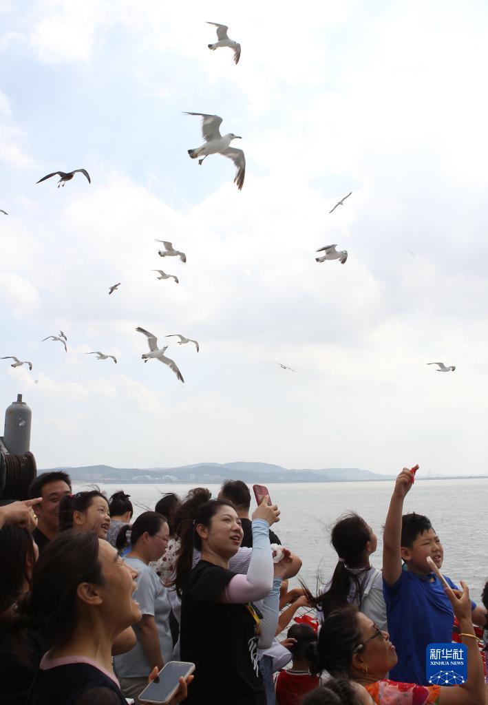 8月3日,游客在乘船前往蓬萊長島時觀賞海鷗。