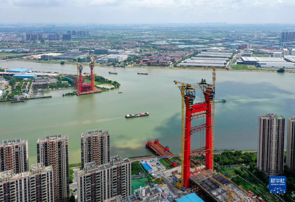 建設中的順德大橋雙主塔(無人機照片,8月4日攝)。