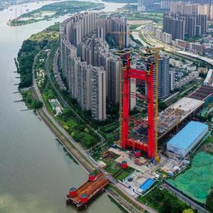 位于廣東佛山市順德區的順德大橋是超大跨徑鋼混組合索塔斜拉橋,由中交路建承建,主橋全長992.5米,主跨626米,索塔采用變截面H型塔柱,塔高分別為204米、151米。目前,承建單位正采用自主研發的“智能鋼塔提升機”進行順德大橋主塔和橫梁無支架整體安裝作業。大橋建成后將有效打通順德融入粵港澳大灣區“一小時交通圈”的內部區域道路瓶頸。