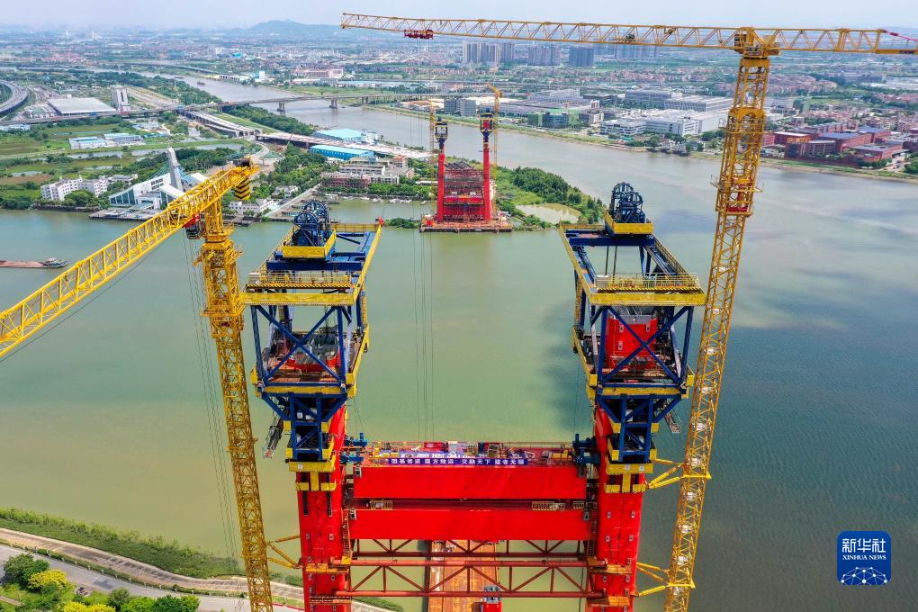 位于廣東佛山市順德區的順德大橋是超大跨徑鋼混組合索塔斜拉橋,由中交路建承建,主橋全長992.5米,主跨626米,索塔采用變截面H型塔柱,塔高分別為204米、151米。目前,承建單位正采用自主研發的“智能鋼塔提升機”進行順德大橋主塔和橫梁無支架整體安裝作業。大橋建成后將有效打通順德融入粵港澳大灣區“一小時交通圈”的內部區域道路瓶頸。