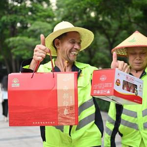 當日,在福州市鼓樓區,一些環衛工人領到由工會發放的西瓜、愛心涼茶、清涼大禮包等高溫防暑慰問品。