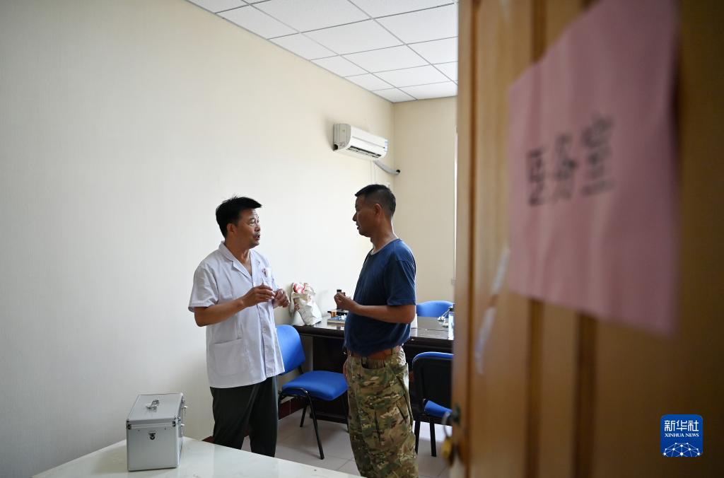 8月4日,郝慶水(右)在第六埠村安置點內的醫務室和醫生交流。