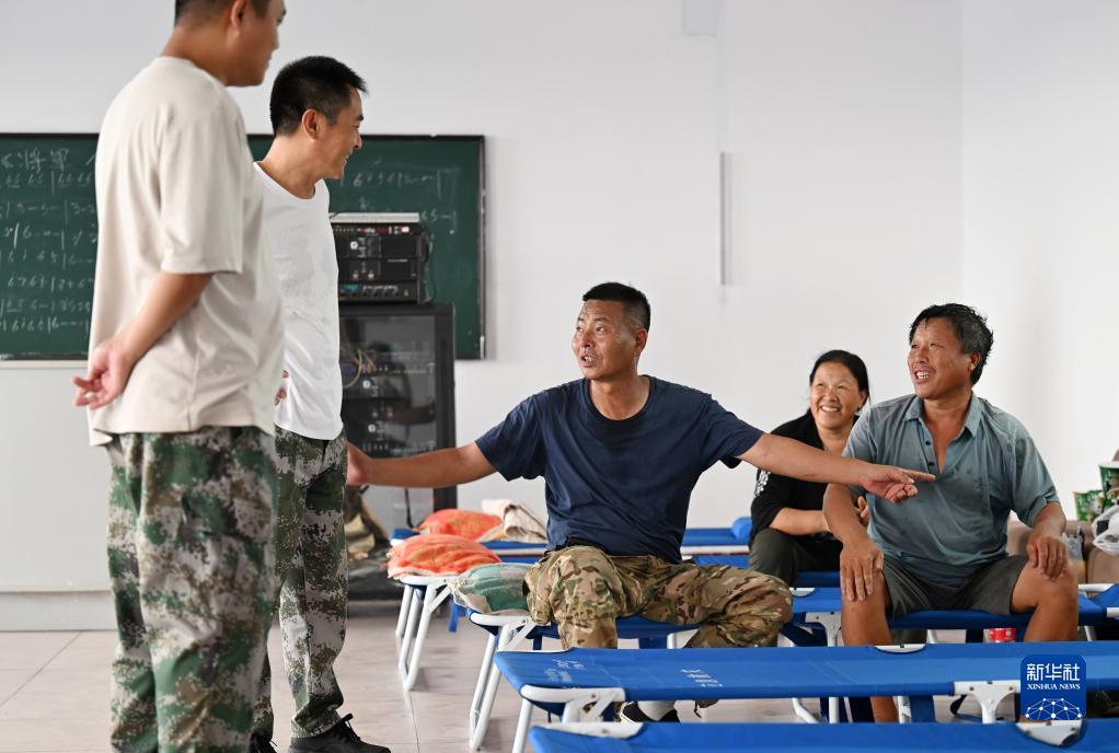 8月4日,郝慶水(左三)和村干部一起在第六埠村安置點和群眾交流。
