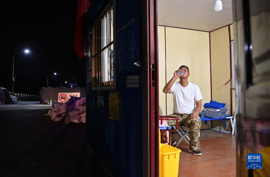 郝慶水在臨時板房內喝水休息(8月3日攝)。
