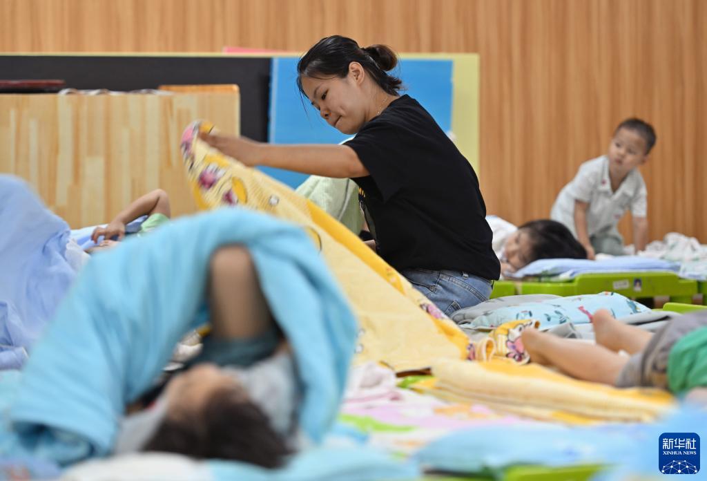 8月4日,??谝患矣變簣@的老師帶著參加暑期托管的小朋友午休。