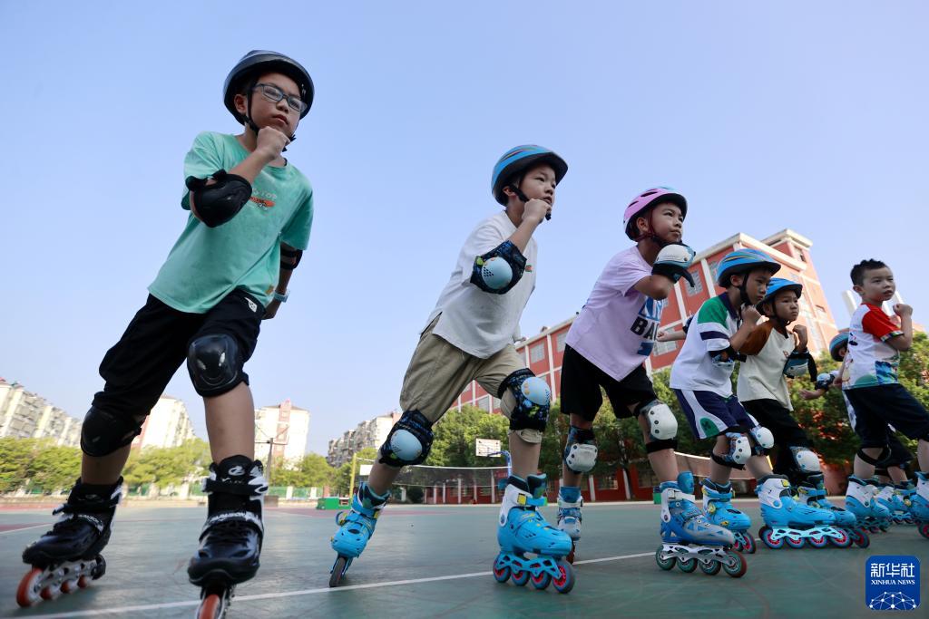 8月4日,在江西省吉安市峽江縣實驗小學,孩子們進行輪滑訓練。