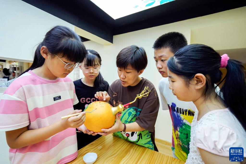 8月4日,民間藝人在河北省遵化市一公益培訓班指導孩子們創作葫蘆畫。
