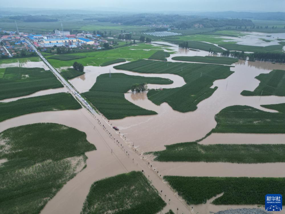 這是8月4日拍攝的吉林省舒蘭市開原鎮部分受洪水侵襲的道路和農田(無人機照片)。