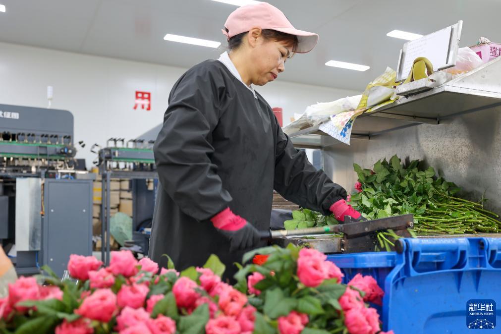 在云天化晉寧花卉產業現代化示范園內,一名花農在對包裝流水線上的鮮花進行裁切(7月12日攝)。新華社記者 崔文 攝