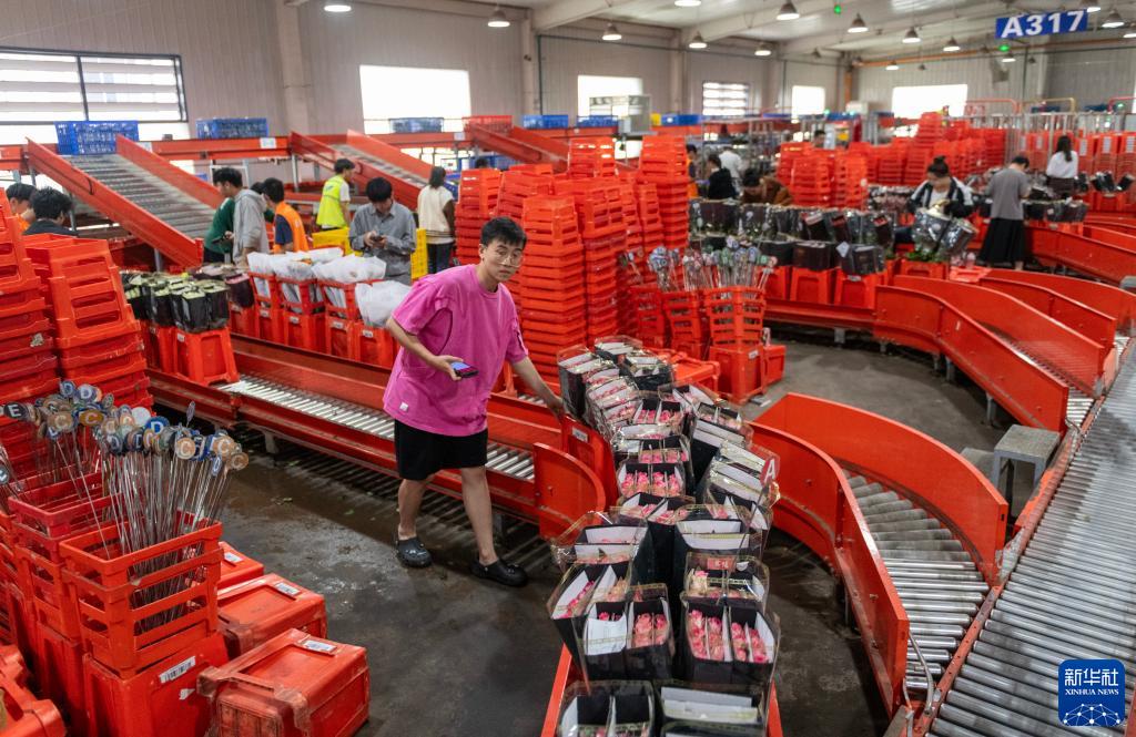 在昆明國際花卉拍賣交易中心,一名質檢員將質檢分級后的鮮花推入傳送帶(7月13日攝)。新華社記者 陳欣波 攝