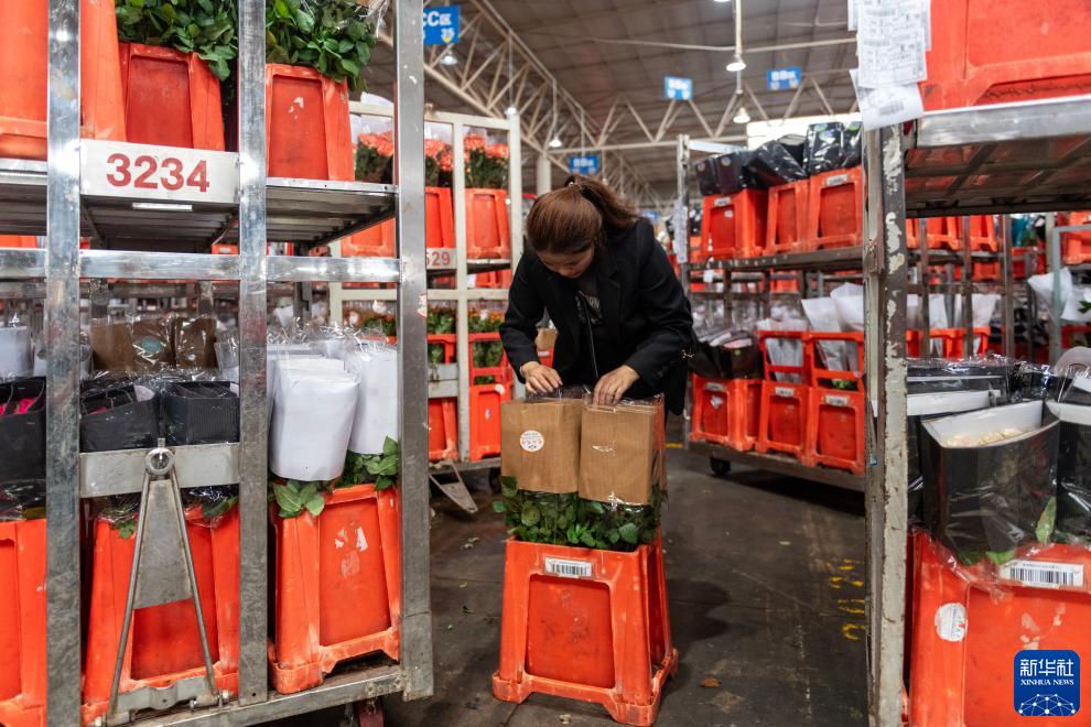 一名花商在昆明國際花卉拍賣交易中心提貨區查看自己拍得的鮮花(7月13日攝)。新華社記者 陳欣波 攝