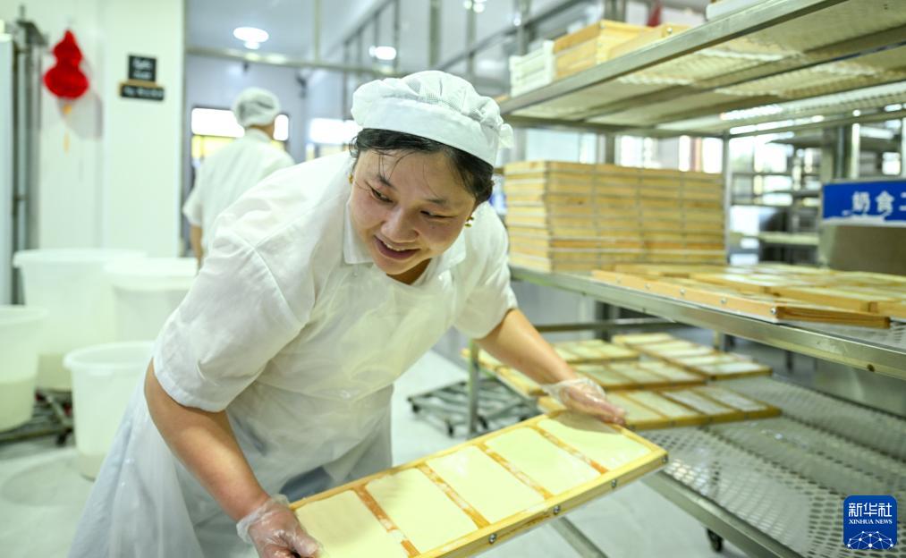 8月3日,在扎魯特旗百順養殖專業合作社,一名工作人員制作奶豆腐。