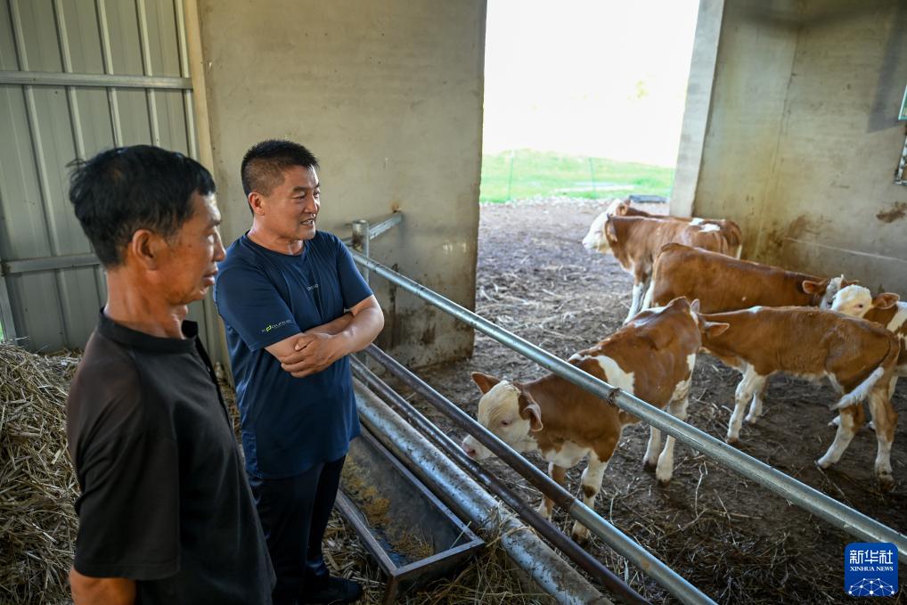 8月3日,在扎魯特旗巨日合鎮,百順養殖專業合作社負責人楊紹武(右)和養殖戶李和查看牛犢繁育情況。