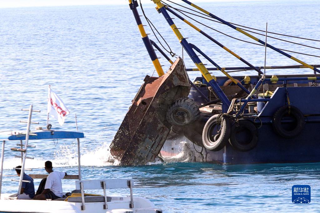 8月3日,在埃及胡爾加達附近水域,一輛廢棄的裝甲車被沉入海底特定區域。