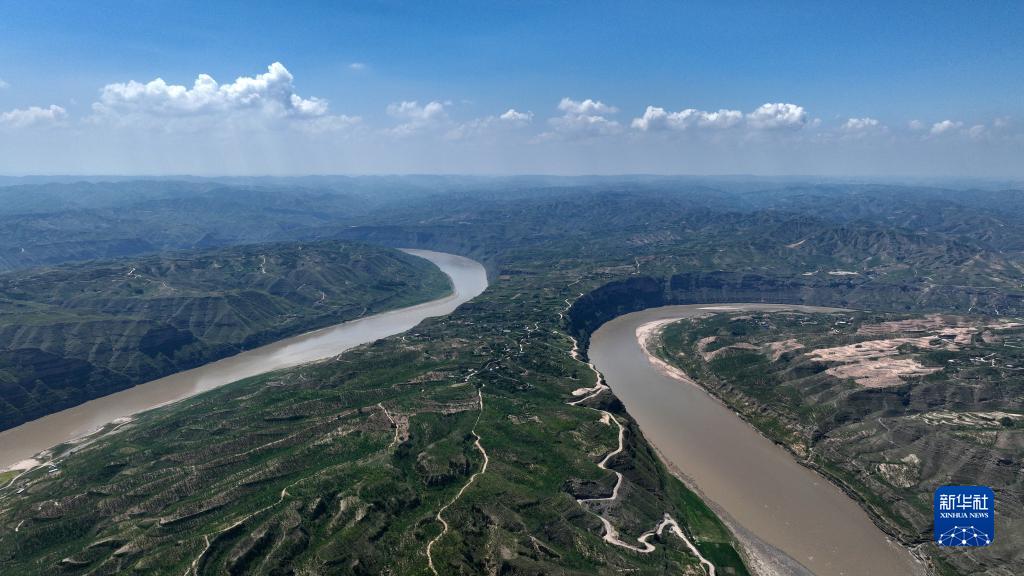 在山西省石樓縣辛關鎮拍攝的黃河奇灣(8月3日攝,無人機照片)。