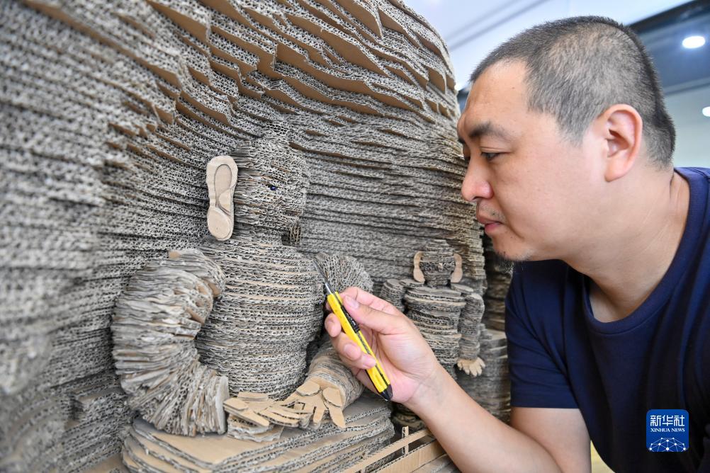 王帥棟在位于山西省太原市小店區的工作室內修整瓦楞紙作品(8月1日攝)。