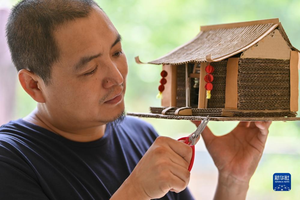 王帥棟在位于山西省太原市萬柏林區的工作室內修整瓦楞紙作品(8月1日攝)。