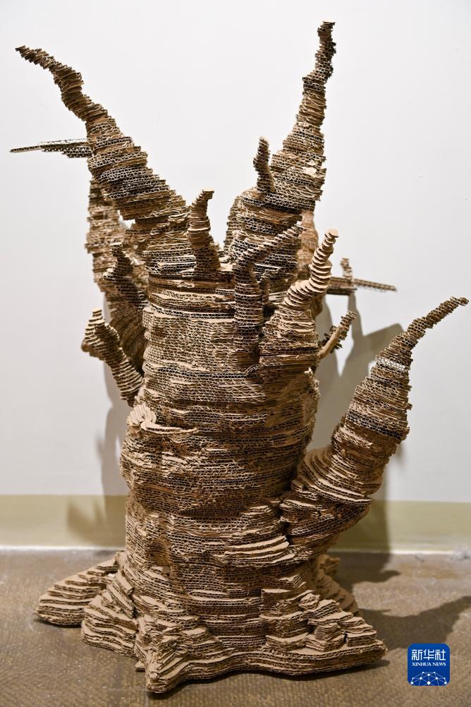 這是王帥棟以洪洞大槐樹為原型創作的瓦楞紙作品(8月1日攝)。