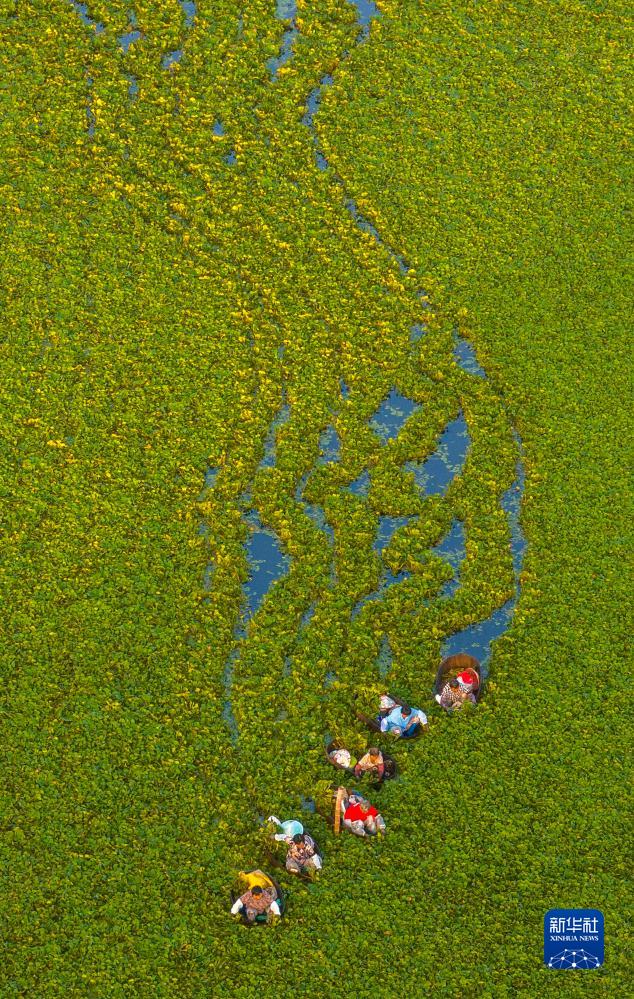 8月5日,江蘇省泰州市姜堰區溱潼鎮溱東村村民劃著菱桶采摘菱角(無人機照片)。