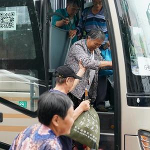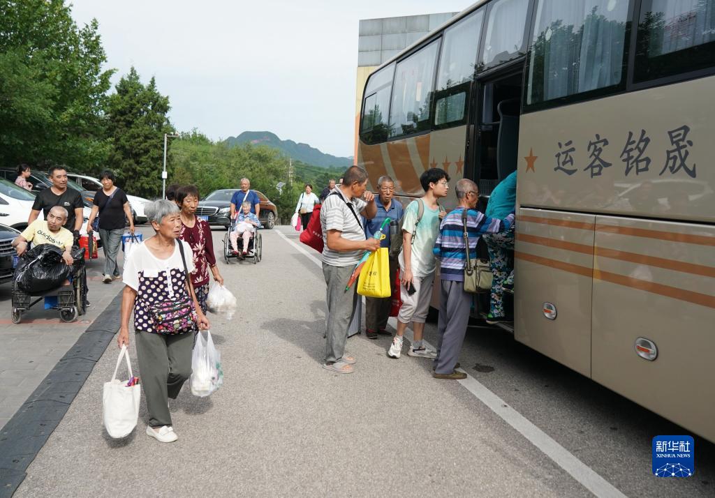 8月5日,北京市房山區青龍湖鎮口頭村村民在安置點登上接他們回家的大巴。
