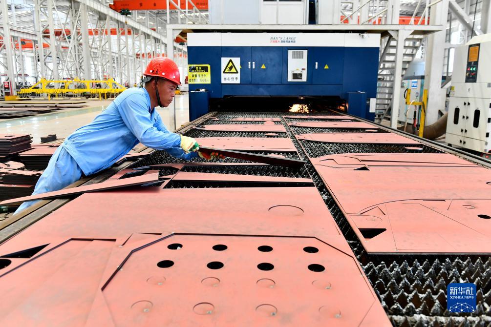 8月5日,在德譽精工科技(日照)有限公司,工作人員在查看激光設備切割后的鋼板。
