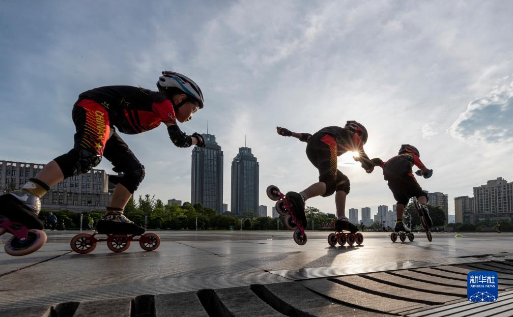 7月30日,孩子們在重慶市南川區市民廣場迎著朝陽練習輪滑。