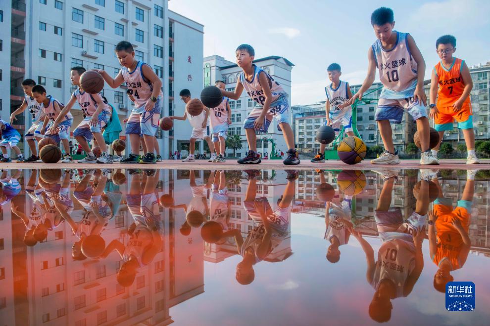 7月29日,孩子們在湖南省永州市道縣一籃球訓練營進行籃球訓練。