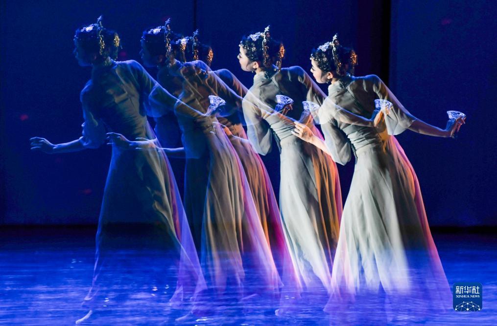 8月3日晚,北京舞蹈學院青年舞團演員在新疆藝術劇院劇場演出(多重曝光)。