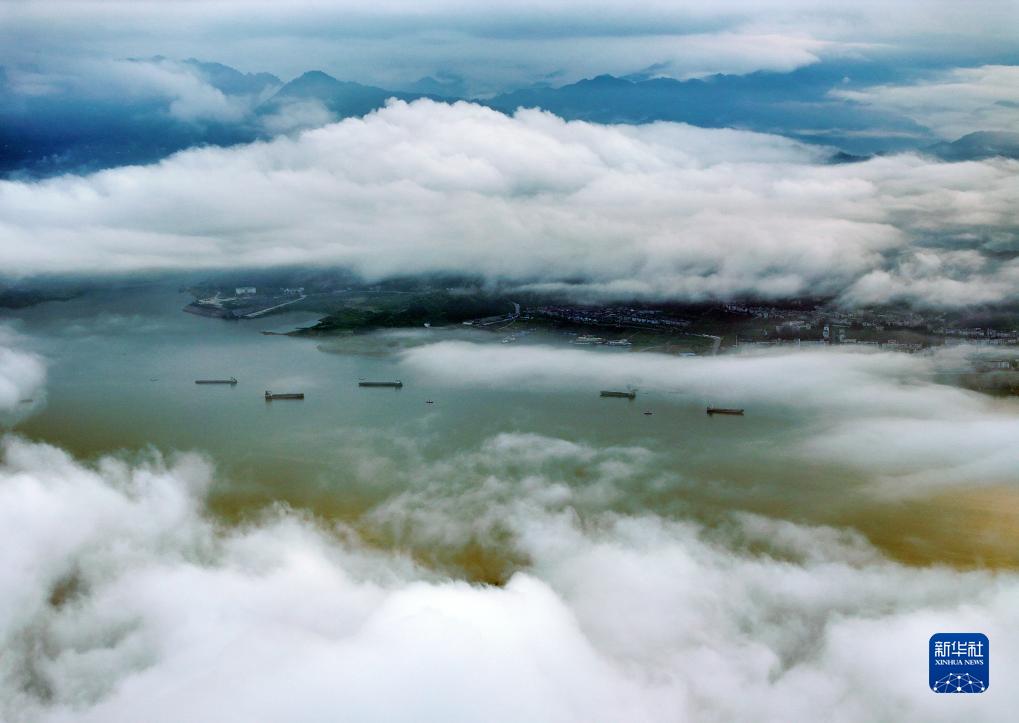 7月30日,船舶行駛在三峽大壩壩前水域(無人機照片)。