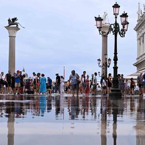 8月4日,游客走在意大利威尼斯積水的道路上。