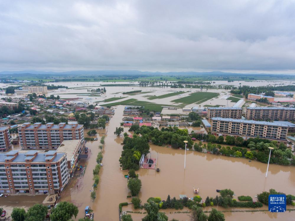 黑龍江省哈爾濱市延壽縣部分縣城被淹(8月5日攝,無人機照片)。