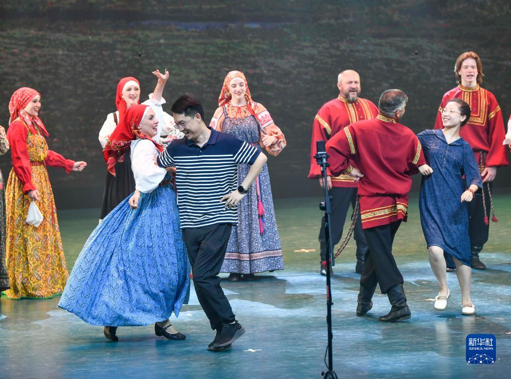 在烏魯木齊晚報劇院,俄羅斯薩拉托夫州曙光歌舞團的演員們邀請現場觀眾同臺共舞(7月22日攝)。