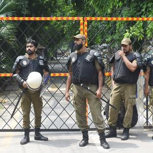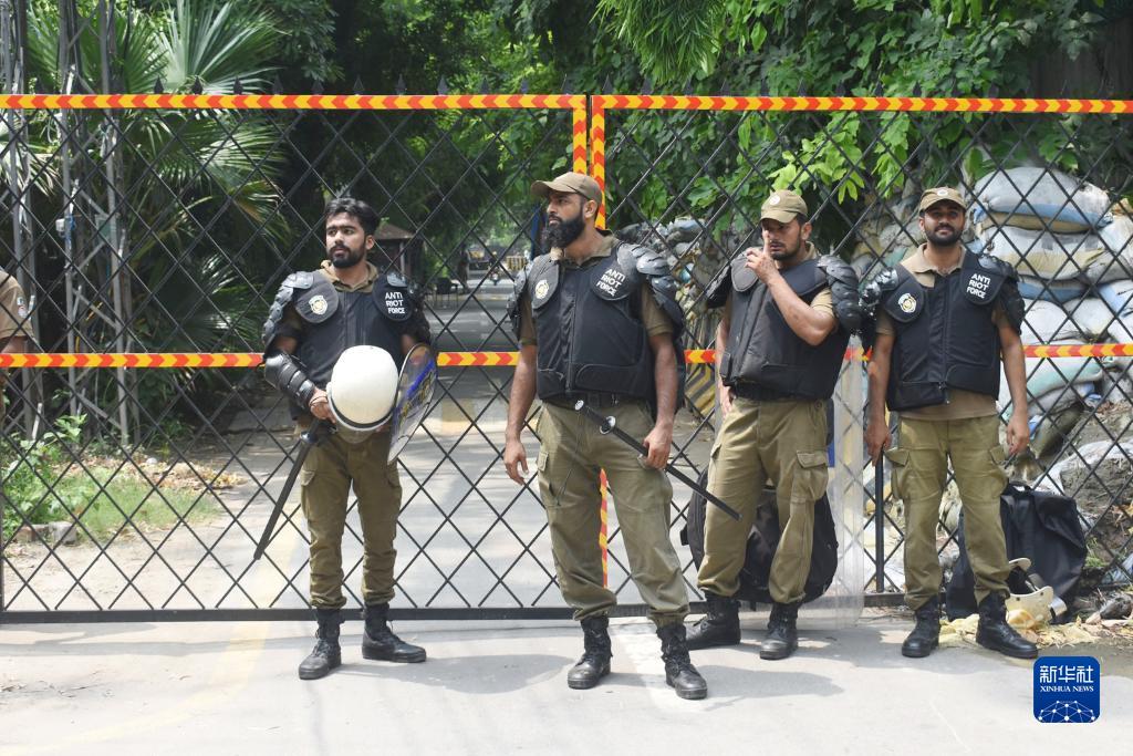 8月5日,警察在伊姆蘭·汗位于巴基斯坦東部旁遮普省首府拉合爾的私邸附近警戒。