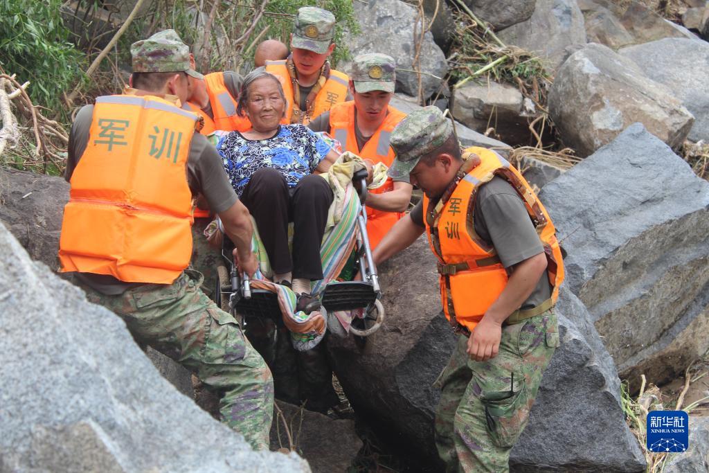 陸軍第81集團軍某旅搜救隊官兵在冀西北受災地區轉移胯骨受傷的老人通過險灘(8月2日攝)。新華社發(王金超 攝)