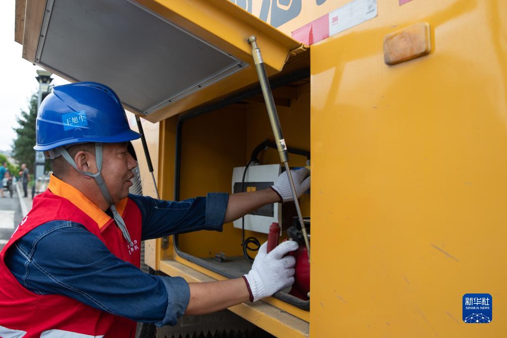 8月6日,工作人員在海林市長汀鎮上進行臨時供電。
