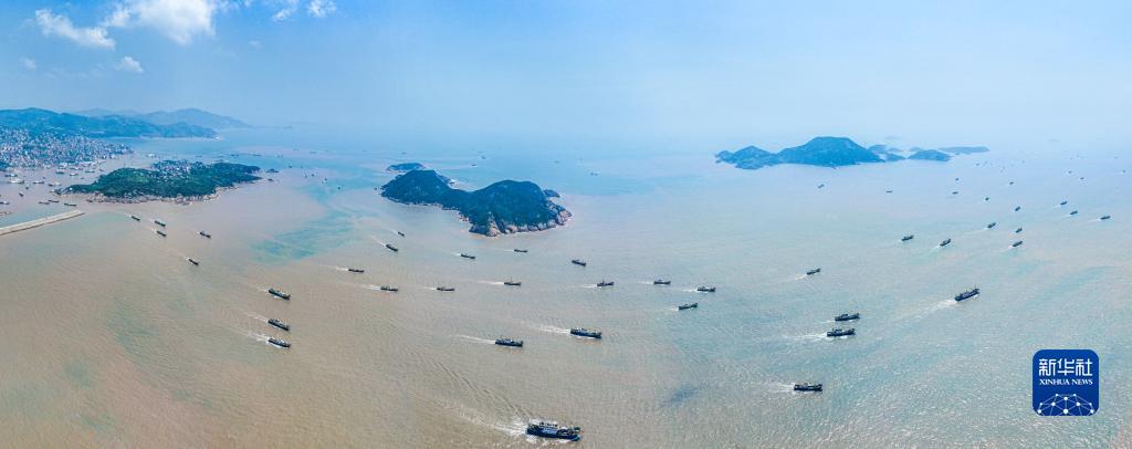 8月6日,浙江省溫嶺市石塘鎮釣浜漁港,大批漁船駛向大海(無人機照片)。