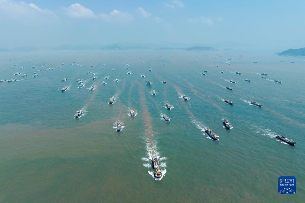 8月6日,浙江省溫嶺市漁船揚帆駛向東海(無人機照片)。