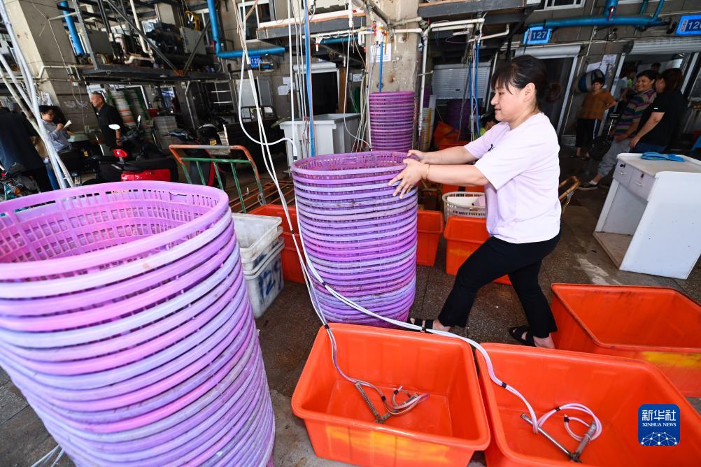8月6日,舟山國際水產城海鮮活品經營戶在為迎接開漁后首批漁獲做準備工作。