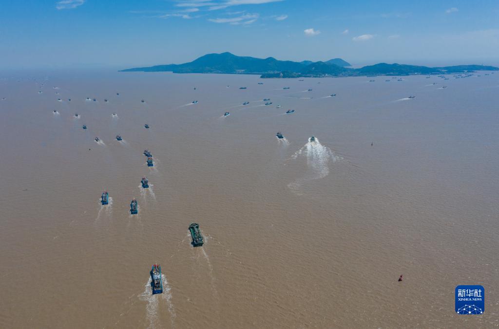 8月6日,漁船從舟山普陀沈家門漁港駛出,前往東海漁場(無人機照片)。