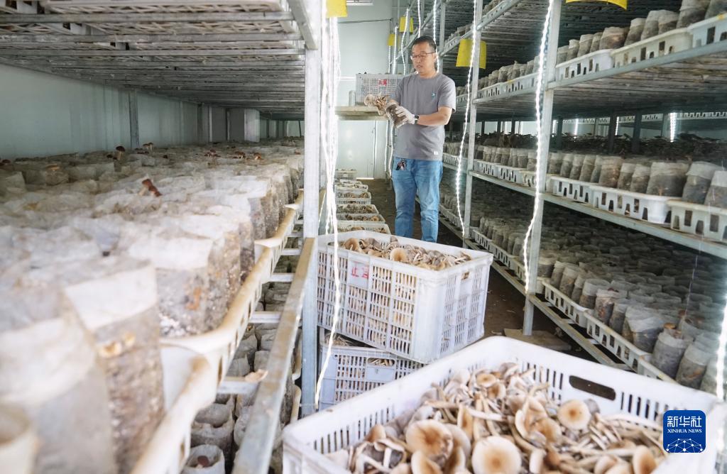 8月5日,工人在壽寧縣下黨鄉下黨村的食用菌產業園有機菌菇種植車間采摘茶樹菇。