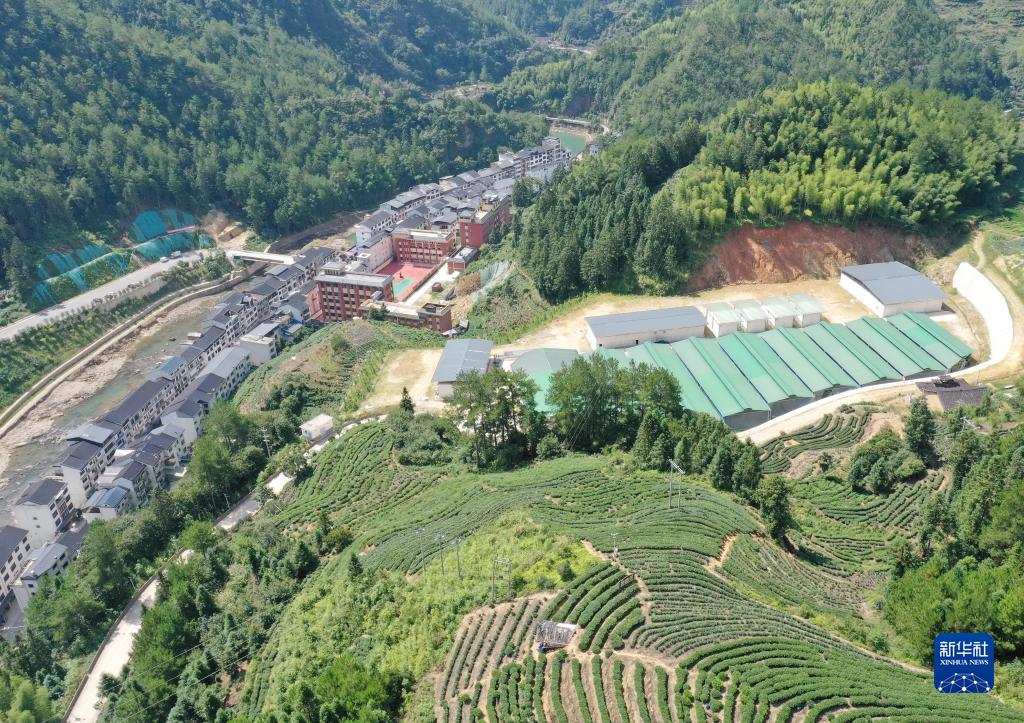 8月5日拍攝的壽寧縣下黨鄉下黨村村貌、有機珍稀食用菌生產基地(右)和附近的茶山景觀(無人機照片)。